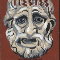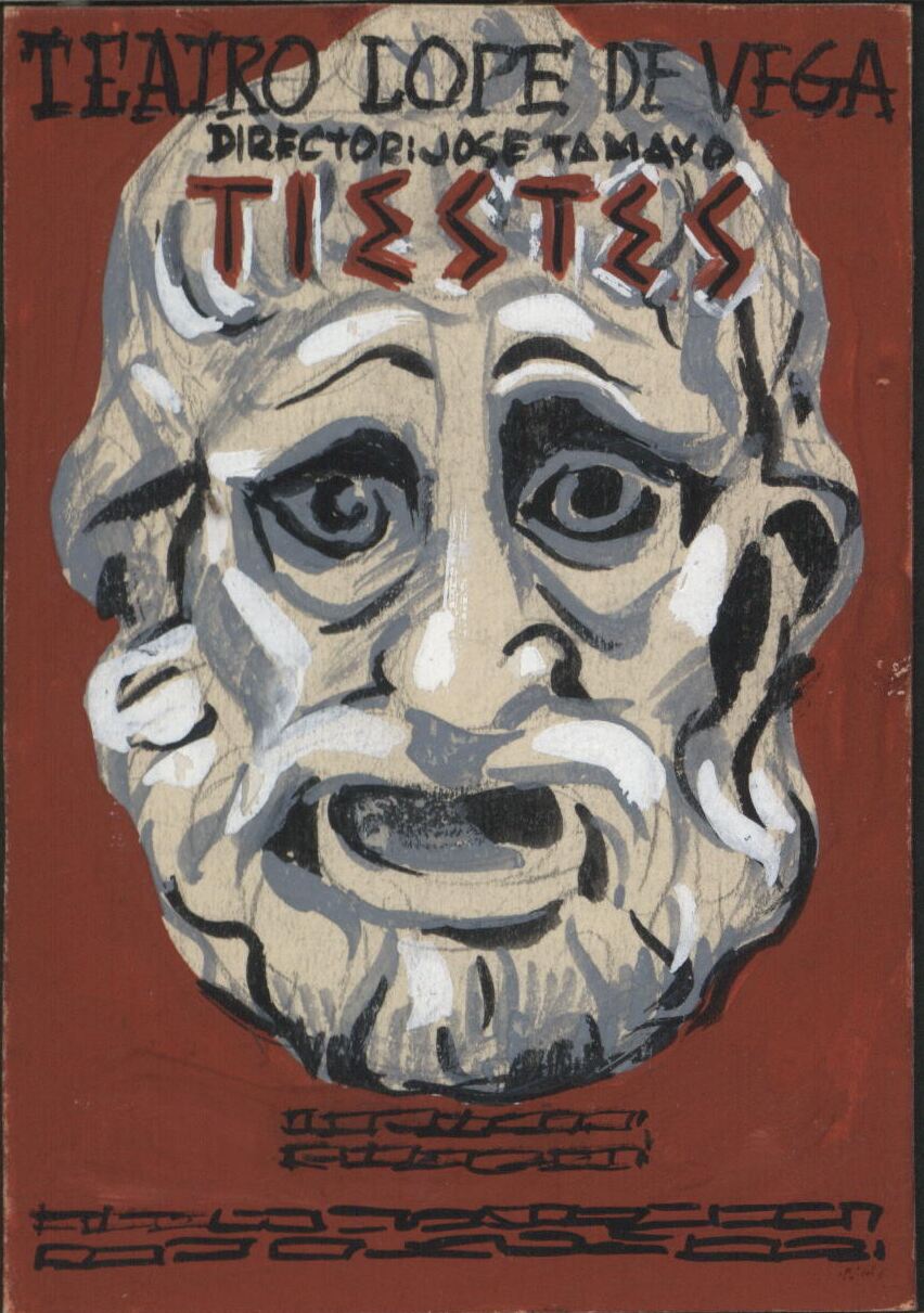 - En este cartel se puede leer en color negro y en la parte superior “Teatro Lope de Vega. Director José Tamayo”. Por debajo se lee el título en color rojo: Tiestes. Y en la parte inferior se ven unas frases abocetadas de difícil lectura. Sobre un fondo rojo se ha representado la máscara blanca grisácea de un hombre envejecido con los ojos abiertos y la boca abierta.