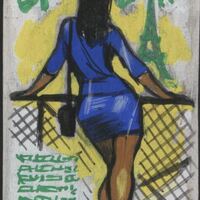 Con el título de “españolas en París” en la parte superior de esta composición y en color verde se ve la imagen de una mujer de pelo negro y largo, con un traje de falda corta y azul apoyada a una verja mientras observa el paisaje lejano en el que destaca el monumento de la Torre Eiffel. En el lado derecho de su figura se ven algunas palabras en verde de difícil lectura por tratarse de bocetos. El fondo del dibujo es gris y en el centro destaca el color amarillo resaltando el paisaje observado por la mujer.