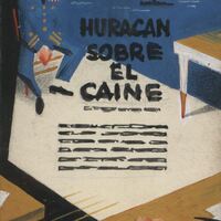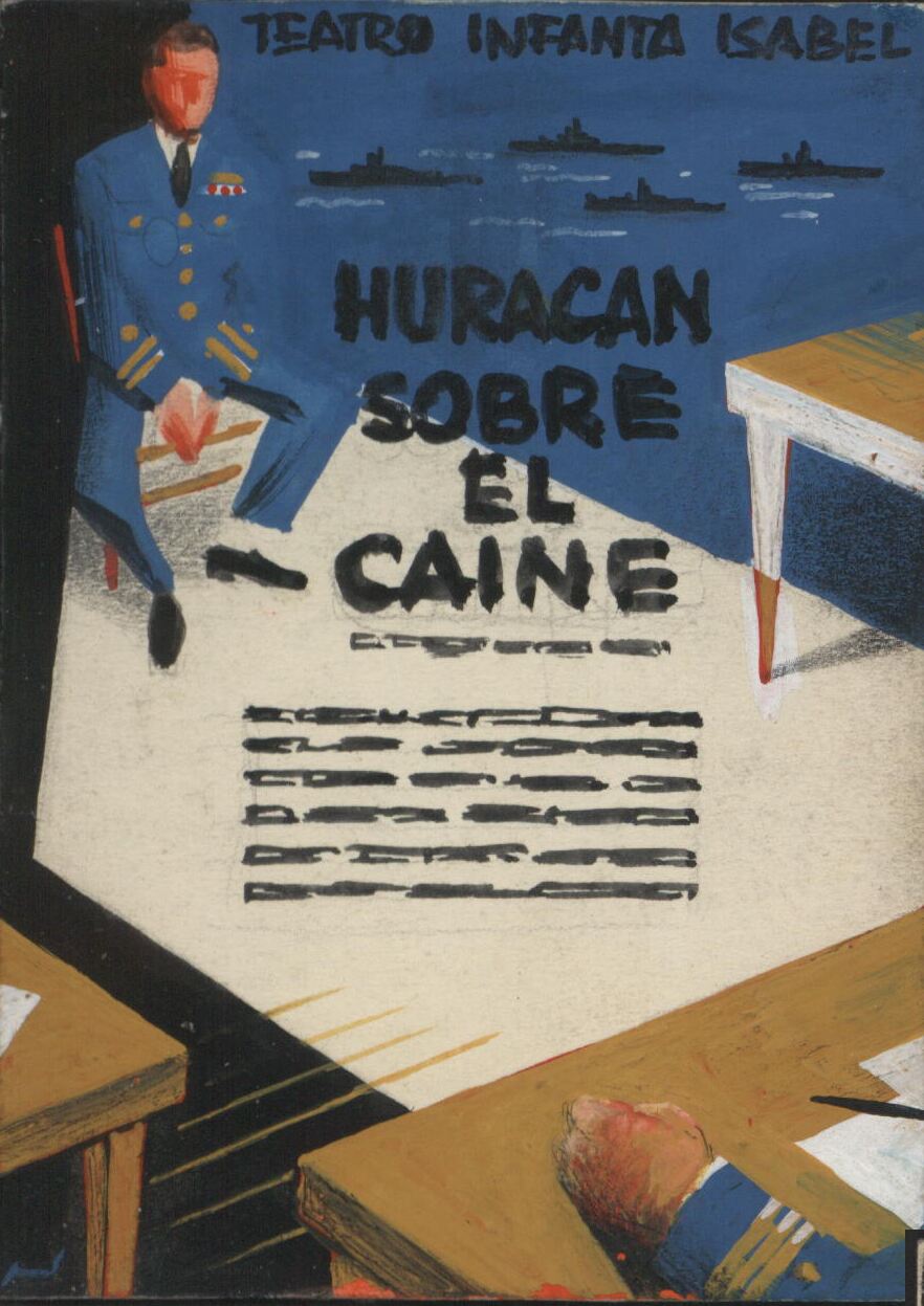 En el centro de una escena en la que parecen estar juzgando a un hombre con traje militar de color azul y sentado en un banquillo se ve el título y palabras de difícil lectura. En un segundo plano está representado un paisaje marítimo en el que navegan algunos barcos. En primer plano se vislumbra el brazo de un militar sobre una mesa. En la parte superior se puede leer “teatro Infanta Isabel”.Boceto para el teatro Infanta Isabel,