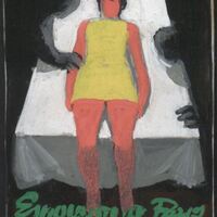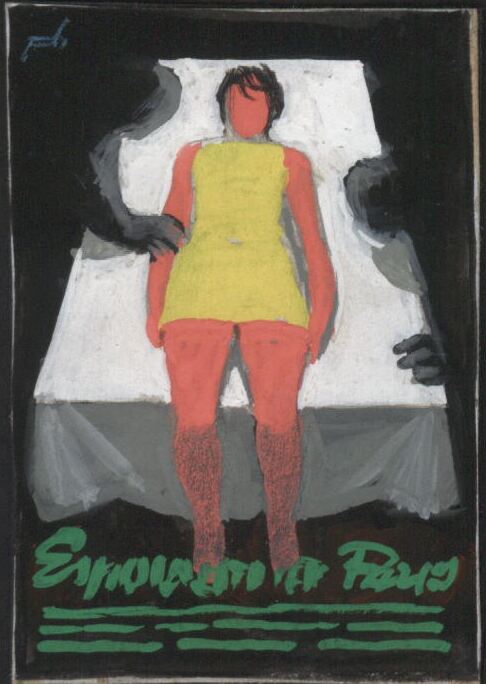 - Firmado este cartel en su parte superior, a la derecha y en color azul se ve la imagen de una mujer de pelo oscuro con un vestido amarillo echada en una camilla blanca y siendo observada por algunas figuras a los lados de la composición. El título está en la parte inferior y es de color verde. Por debajo se ven algunas palabras abocetadas de complicada lectura.