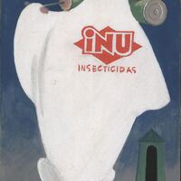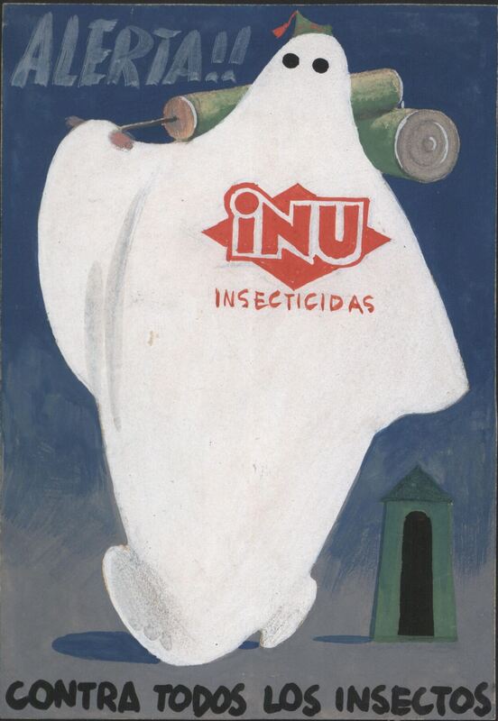 En este dibujo en el que se anuncia un producto contra los insectos llamado “inu” como se puede ver en la parte central en color rojo se ha dibujado la imagen de un fantasma blanco, sobre un fondo azul, llevando en su espalda algunos explosivos verdes. En un segundo plano se vislumbra una casota verde.