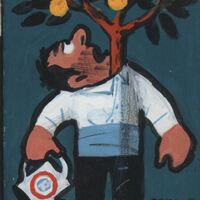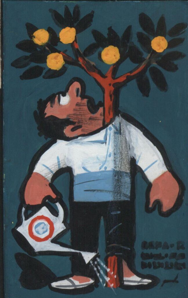 Sobre un fondo azulado se ve la imagen de un hombre regando un árbol con frutos amarillos y que de una forma curiosa crece por dentro de su ropa. El cuerpo del hombre está de frente pero su cabeza de perfil la eleva mirando el árbol en una actitud de asombro. Su traje se compone de una camiseta y zapatillas blancas y pantalón negro. En la parte inferior se puede ver una inscripción de difícil lectura al igual que el boceto de la firma del pintor.