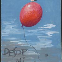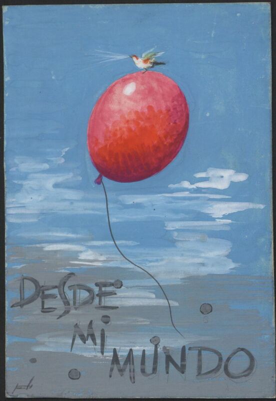 - Sobre un fondo azulado y gris, queriendo parecer el cielo, se ha representado un globo rojo atado con una cuerda fina. Sobre él está posado un pájaro muy pequeño. En la parte inferior se puede leer en letras oscuras “desde mi mundo”. En la esquina inferior de la derecha está presente la firma del pintor.
