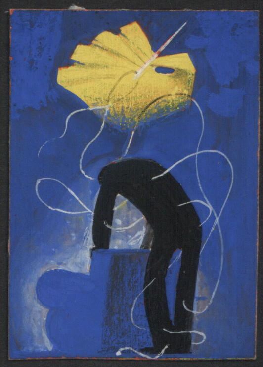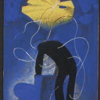 - Sobre un fondo muy azul se ha representado, en este dibujo enmarcado, a un hombre negro de espalda apoyando su cuerpo en un sofá atravesado por un hilo blanco que sostiene, por medio de un alfiler, una mano amarilla que surge en la parte superior.