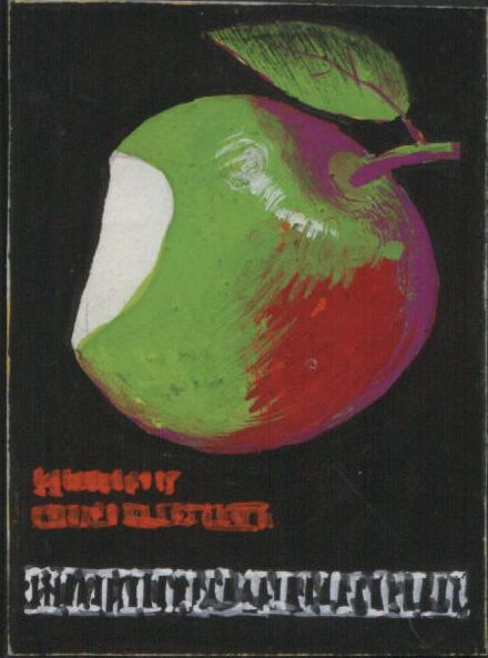 - Sobre un fondo completamente negro y sobre un lema, rojo y blanco, de difícil lectura por sus caracteres abocetados destaca en el centro la imagen de una manzana verde y roja con un mordisco en su lado derecho.