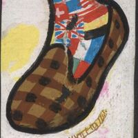 - Se ha representado en este dibujo, cuyo lema es de difícil comprensión ya que está abocetado, una zapatilla a cuadrados marrones y negros y un pie, metido en la zapatilla, tapado con una media en la que destacan dibujos de varias banderas, entre las que destacan la inglesa, la alemana, la francesa, entre otras.