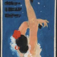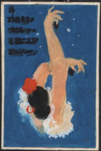 - En el dibujo enmarcado y en un fondo azul destaca la imagen de una bailaora observada desde una perspectiva aérea. En su pelo negro recogido en un moño destaca una gran flor roja. Sus brazos desnudos se elevan hacia arriba con una castañuela en cada mano. En la parte superior, a la derecha, destacan algunas palabras negras de difícil lectura ya que son bocetos.