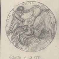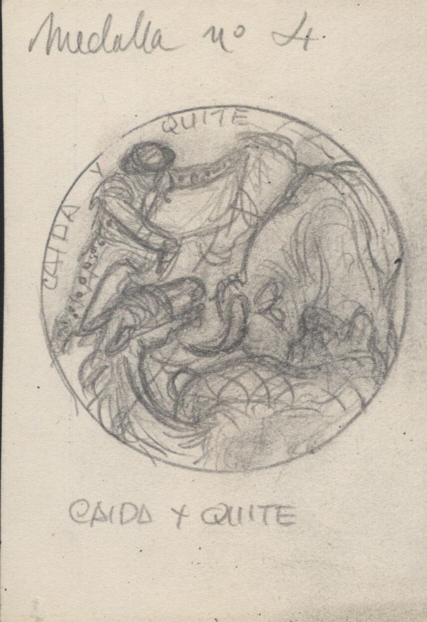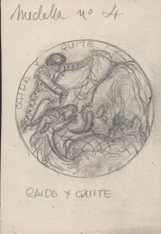 Boceto donde se puede apreciar la figura de un torero con el capote al quite, intentado salvar la situación donde el picador y su caballo son derribados por la embestida del toro, todo ello dentro de una circunferencia que delimita la superficie de la medalla.boceto otro estudio para la seria de TAUROMAQUIA encargado por Acuñaciones Españolas
