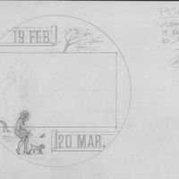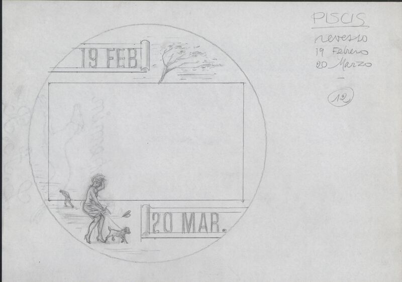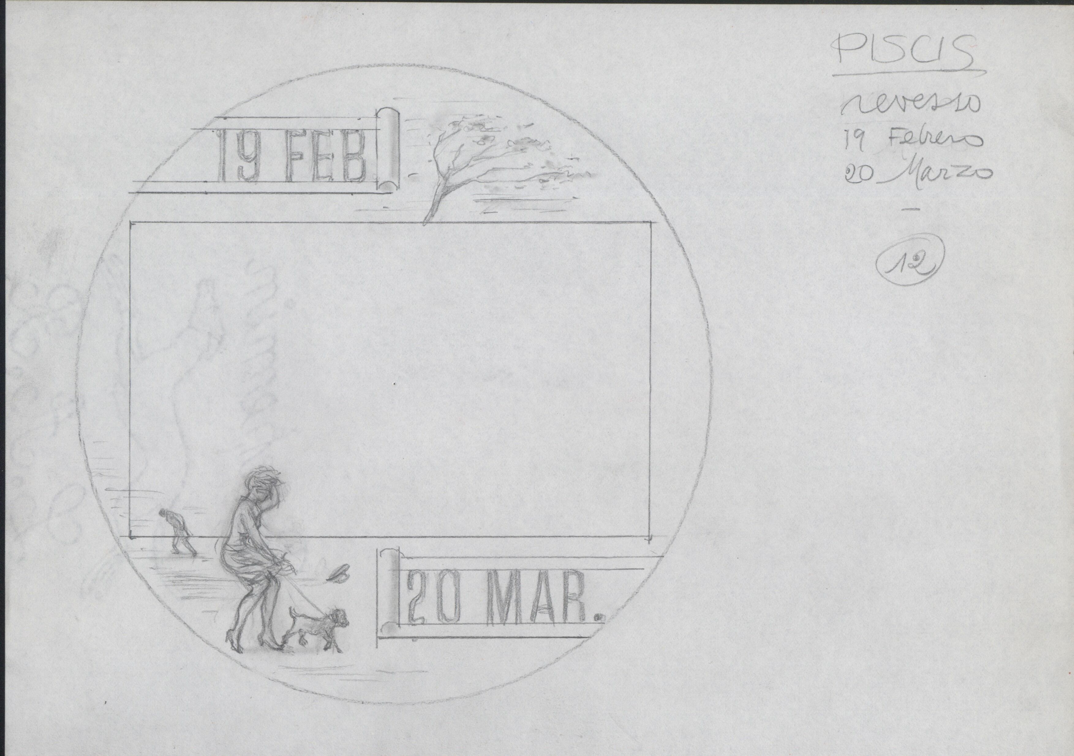 - Boceto a lápiz del reverso de la medalla correspondiente al signo piscis, con las fechas correspondientes al signo y la imagen de una mujer paseando con su perro en un día ventoso, junto a la medalla anotaciones a lápiz del autor.Serie Sgnos del Zodiaco 2ª para Numismatica Iberica reverso (19/02 a 20/03). ME/Br/1584.Img.1) ME/es-ng(No?)