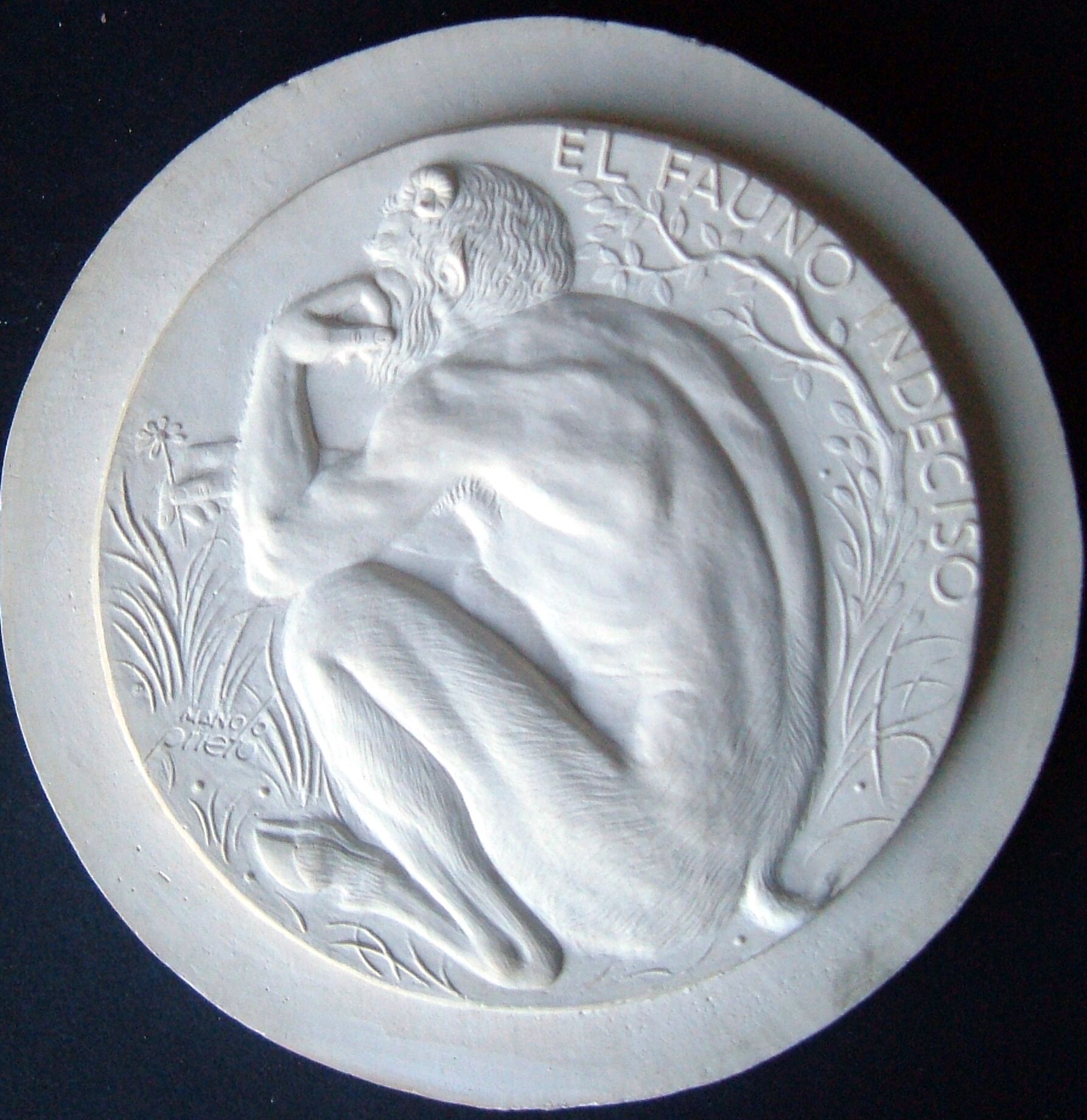 - Molde de escayola de la cara de una medalla donde se aprecia la figura de un fauno de espaldas en aptitud de indecisión, pensativo.
