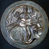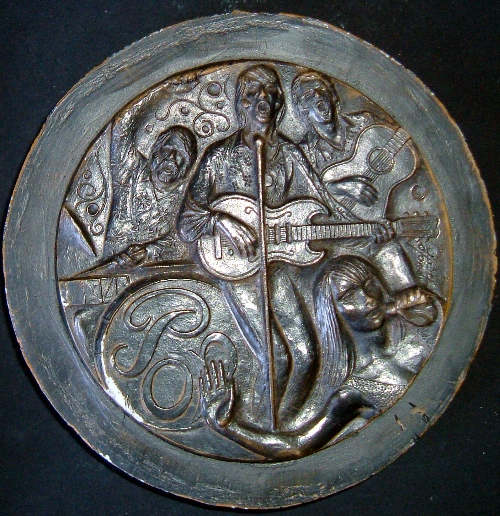 - Bajorrelieve de bronce de la cara de una medalla representativa del grupo inglés los Beatles donde en primer término aparece la cabeza de una fans junto al grupo que está tocando en ese momento. La escayola está también pintada.Medalla realizada por Manolo Prieto para el que solía presentarlas a exposiciones para la FIDEM. Anverso titulo Baile PoP Otros Archivos: Mbo/354 MEN/1828 MG/ 1741+ 1551