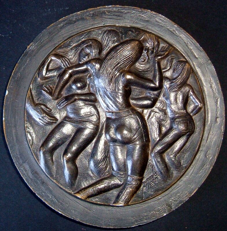 - Bajorrelieve de la cara de una medalla donde se aprecia un grupo de jóvenes bailando animadamente. La escayola está pintada para simular el resultado final que daría posteriormente el bronce.