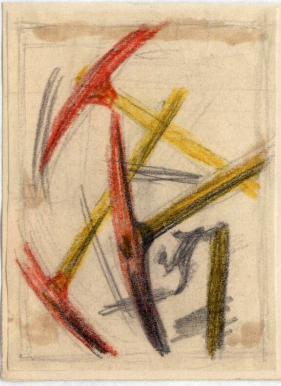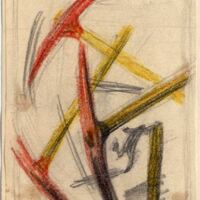 Una sucesión de picas rojas y amarillas, que se mueven de arriba abajo, forman la escena de este dibujo. Entre las picas se vislumbra, a lo lejos, la figura de un hombre corriendo.Boceto realizado para la ilustración de la revista semanal Novelas y Cuentos. Titulo: Wolfran Wolfran. Autor: Carlos Caba. Nº publicado: 1274. Fecha: 09-10-1955. Tomo NC.: 27.