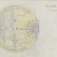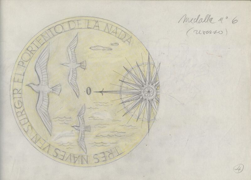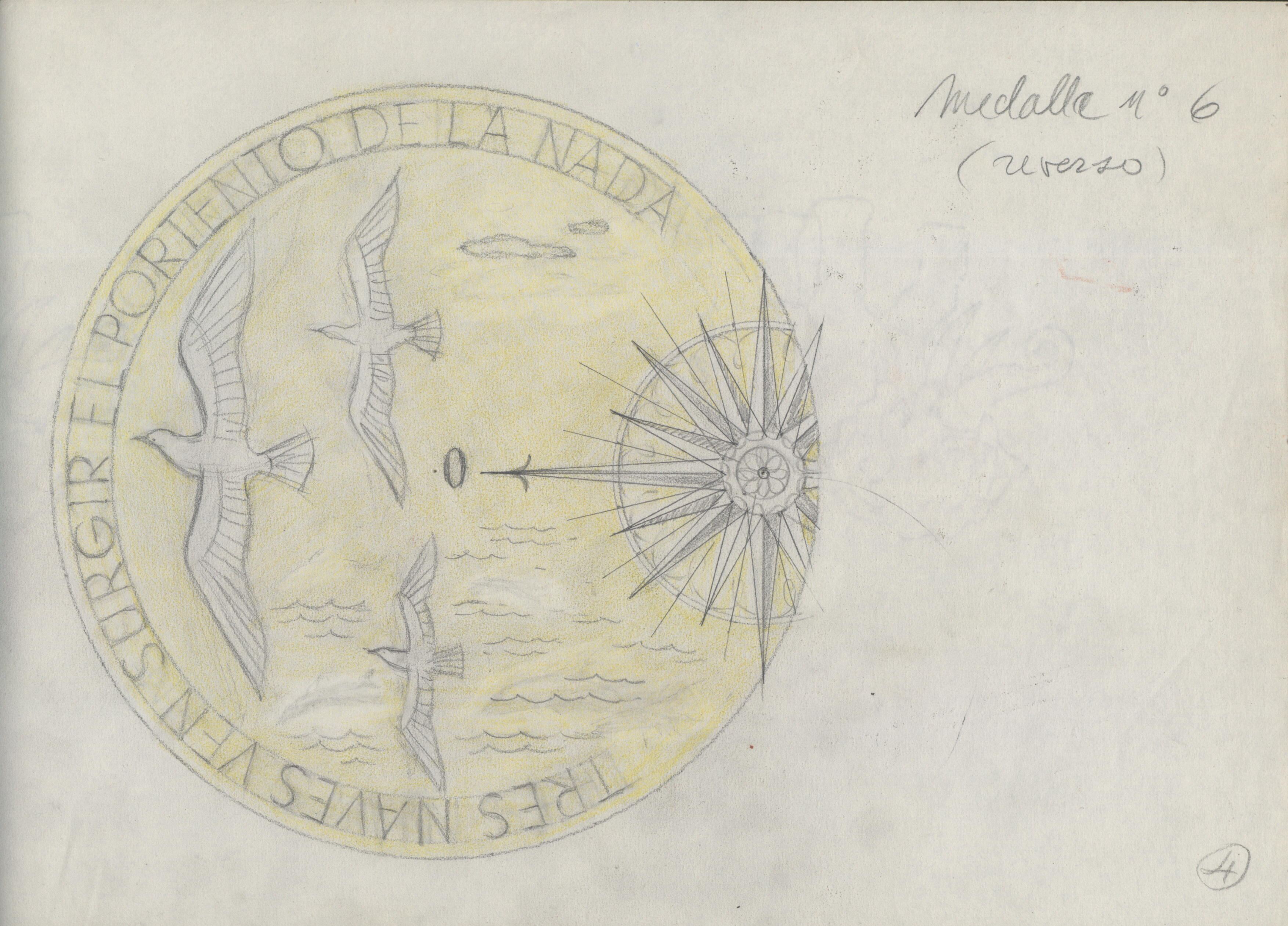 Boceto a lápiz sobre fondo claro del anverso de la medalla número seis con la imagen del vuelo de tres gaviotas junto al dibujo de los puntos cardinales en forma de estrella, en el borde de la medalla las letras en las que se dice “tres naves ven surgir el portento de la nada”.Realizada para Numismatica Iberica, reverso. OTROS ARCHIVOS: MBO/398+440 MBR/1337