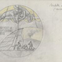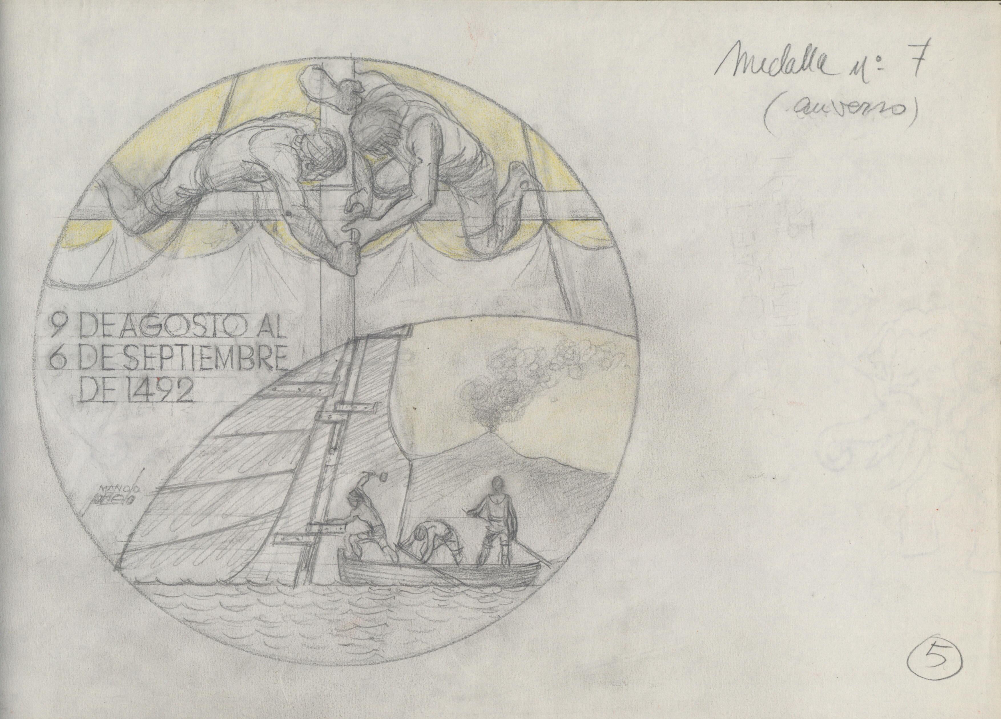 Boceto a lápiz sobre fondo claro del anverso de la medalla número siete, con un dibujo compuesto por dos escenas dividas por un semicírculo y relacionadas entre sí, en la primera observamos a dos marineros que sujetan haciendo fuerza el mástil de una de las velas del barco, debajo la siguiente escena que representa a un grupo de marineros sobre un barco, uno de ellos con un martillo golpeando parte de la madera de la proa del barco y otro de ellos de espaldas observando una de las montañas volcánicas de las islas Canarias en erupción, junto a las letras 9 de Agosto y 6de Septiembre de 1942.Para Numismática Iberica, anverso OTROS ARCHIVOS: MBR/1334 MBO/399+443