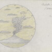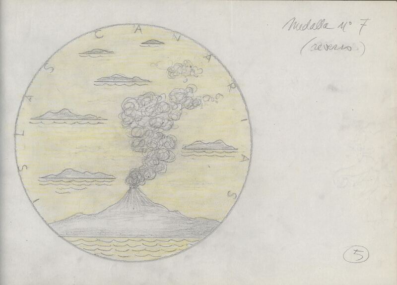 Boceto a lápiz sobre fondo claro del reverso de la medalla número siete, con la silueta de unos de los volcanes en erupción perteneciente a la isla Canarias cuyas letras aparecen ocupando el perfil de la medalla.realizada para Numismatica Iberica, reverso. OTROS ARCHIVOS: MBR/1334 MBO/399+442