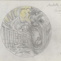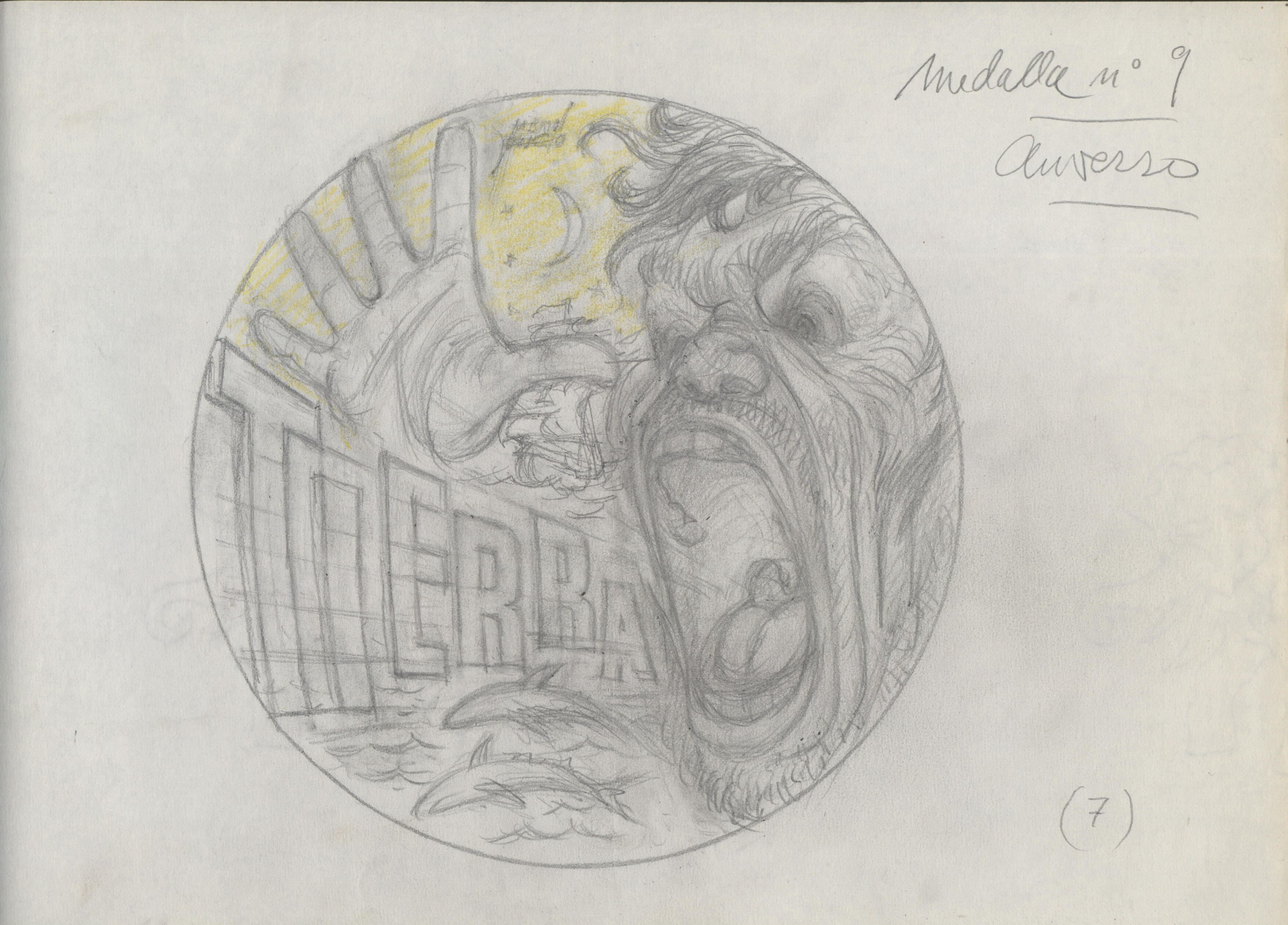 Boceto a lápiz sobre fondo claro del anverso de la medalla número nueve donde en uno de los lados aparece en primer término la boca abierta de la cara de un marinero que grita: ¡Tierra!, cuyas letras están escritas sobre un fondo donde aparece la silueta de una pareja de delfines saltando en el mar.Para Numismática Iberica. OTROS ARCHIVOS: MBO/401+446 MBR/1343