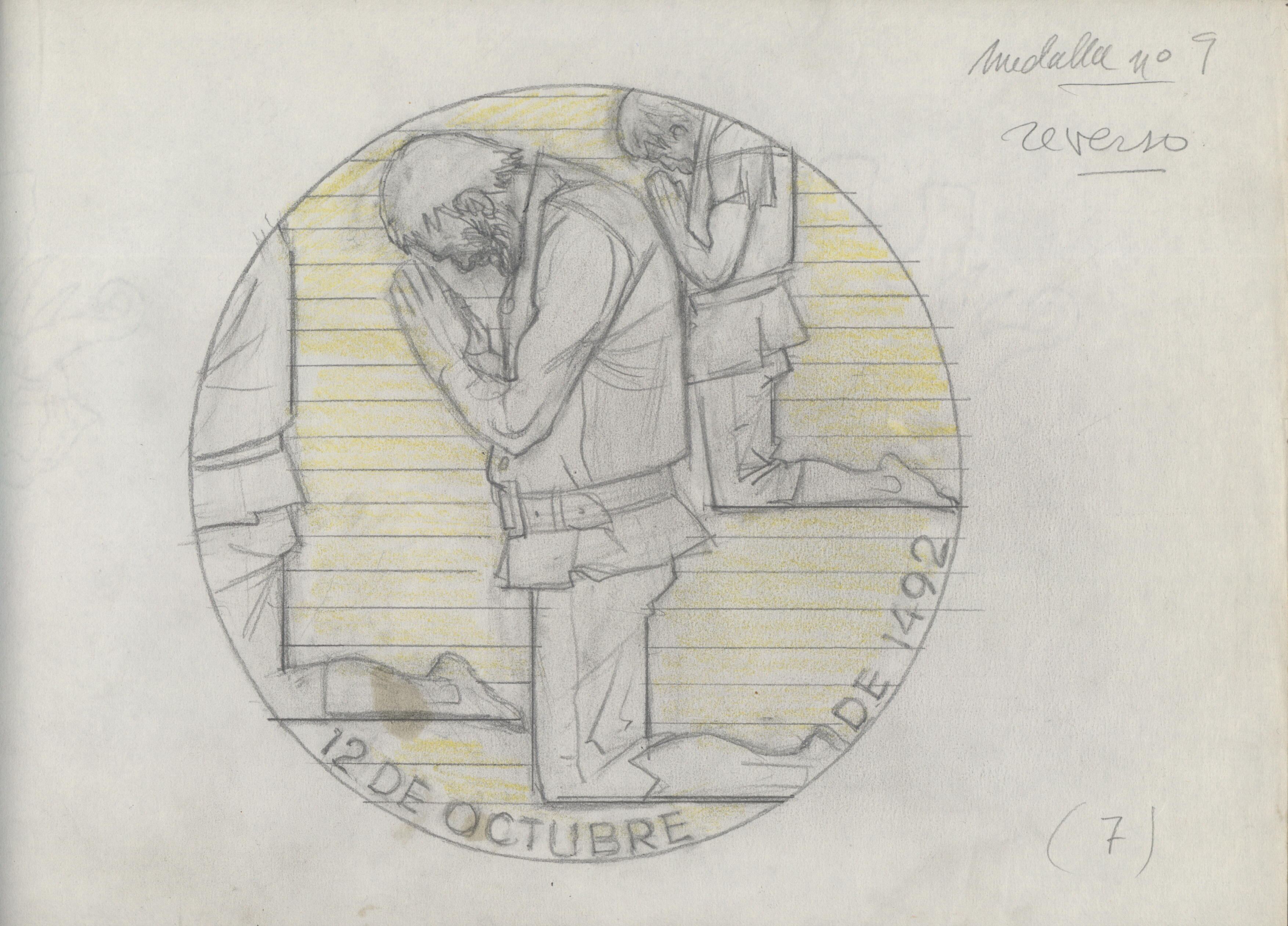 Boceto a lápiz sobre fondo de color amarillo pálido claro a rayas del reverso de la medalla número nueve, donde se aprecia a una pareja de marineros devotos arrodillados y recogidos en aptitud de recogimiento antes de emprender la gran aventura, junto a las letras que dicen “12 de Octubre de 1942.”Para numismarica Iberica Otros archivos: Mbo/401+445 Mbr/1343