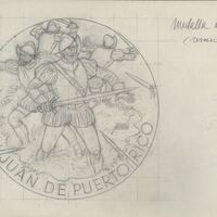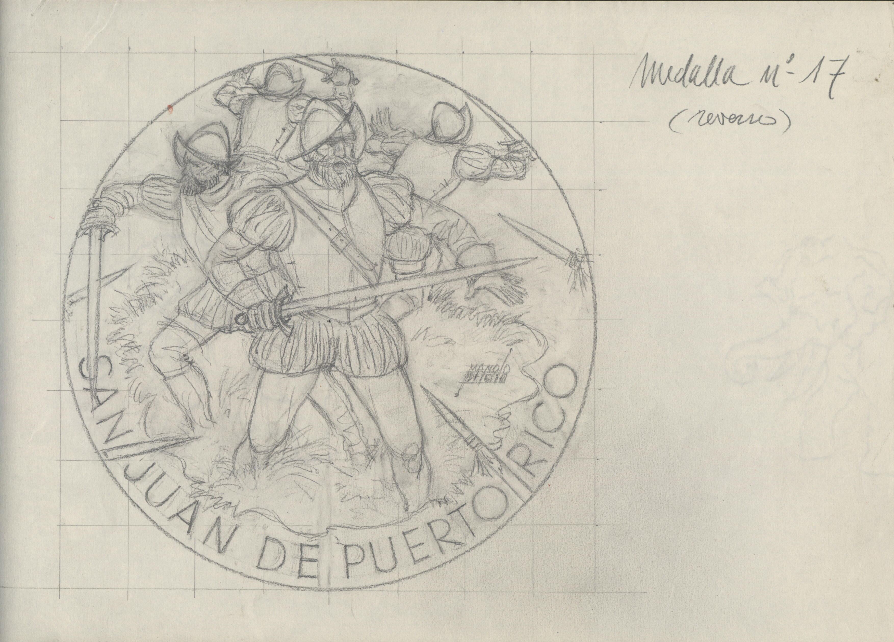 Boceto a lápiz del reverso de la medalla número diecisiete, donde se representa la escena de un grupo de soldados españoles defendiéndose de un ataque, junto a las letras “San Juan de Puerto Rico.”para Numismática Iberica serie del V Centenario. Otros Archivos: MBR1358 MBO/409+464+465
