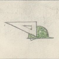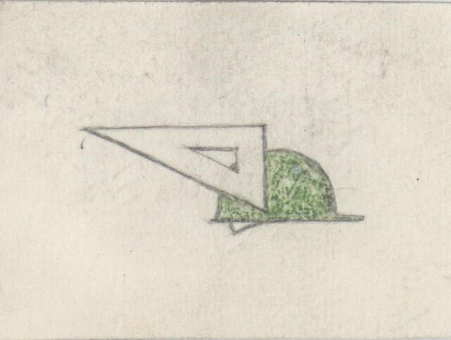 - Superposición de un cartabón y un casco en tonos verdes, ocupando el centro de la imagen. La redondez del casco y la rectitud del cartabón hacen una curiosa y divertida composición.