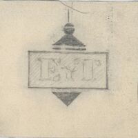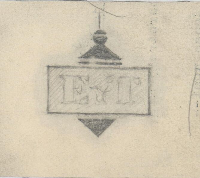 - Boceto de un posible logotipo, donde se observa un cartel de las letras “E” y”T”, insertas en una plomada que pende de un hilo.