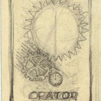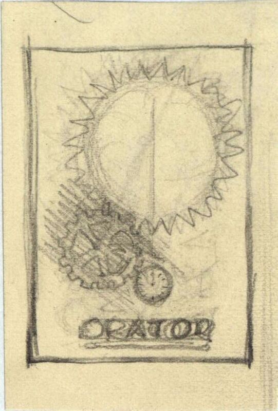 - En este dibujo enmarcado y sin color bajo el lema de “orator” se ha realizado el sistema de maquinaria, a base de ruedas giratorias, de lo que podría ser el interior de un reloj.