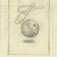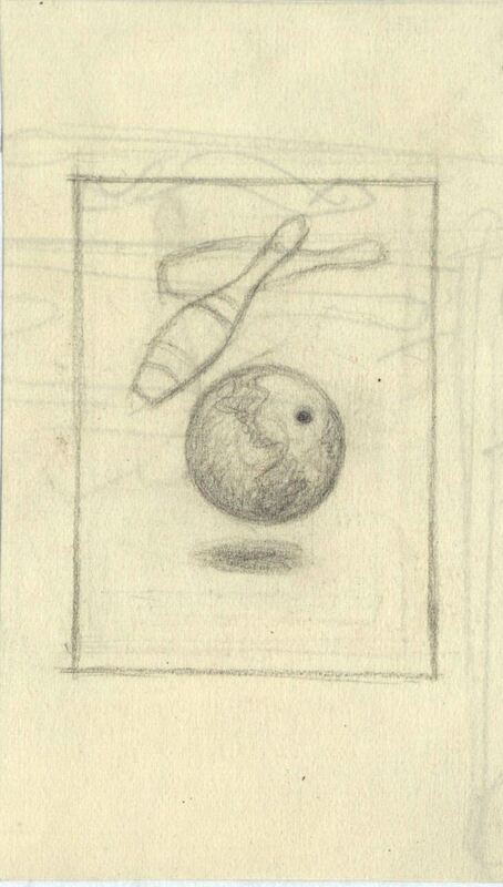 - Dos bolos caídos y una pelota en el aire adivinada por la sombra grisácea que causa en el suelo configuran este dibujo enmarcado.