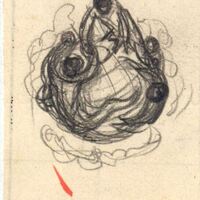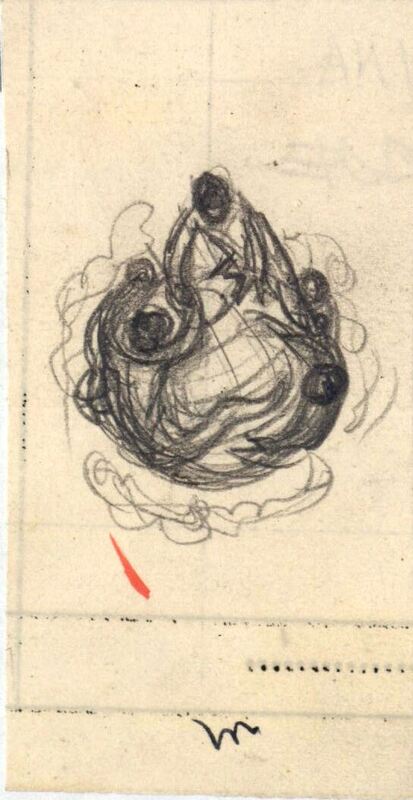 - En el centro del dibujo se destacan con forma circular figuras humanas corriendo un corro. Destacan los colores oscuros sobre un fondo blanco.
