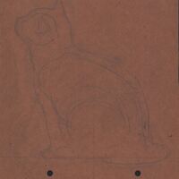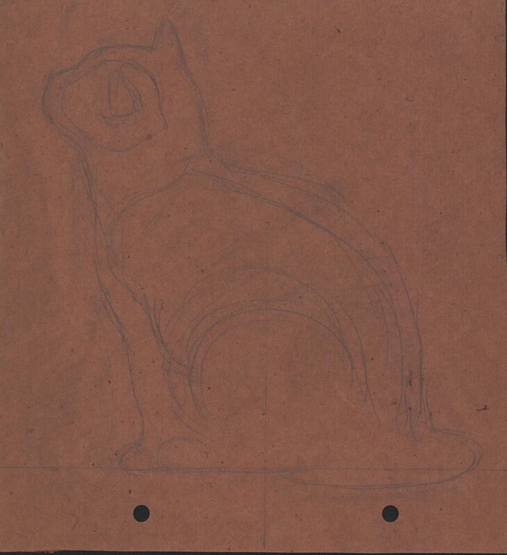- Boceto a lápiz sobre un fondo sepia oscuro –que caso no deja a preciar las líneas sutiles del dibujo- donde se aprecia la elegante silueta de un gato que mira atentamente hacia arriba.