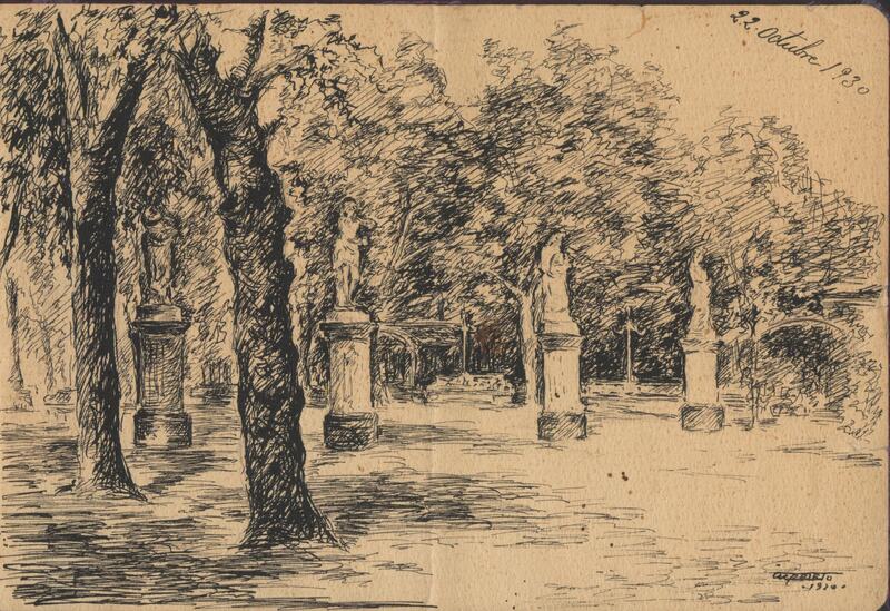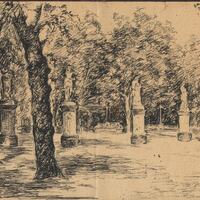 - En este paisaje con grandes árboles se dejan adivinar entre ellos algunas estatuas de estilo clásico. Destacan los colores oscuros. El dibujo está firmado en la parte inferior a la izquierda en una esquina.