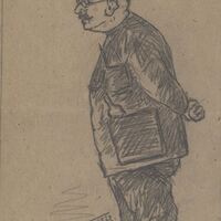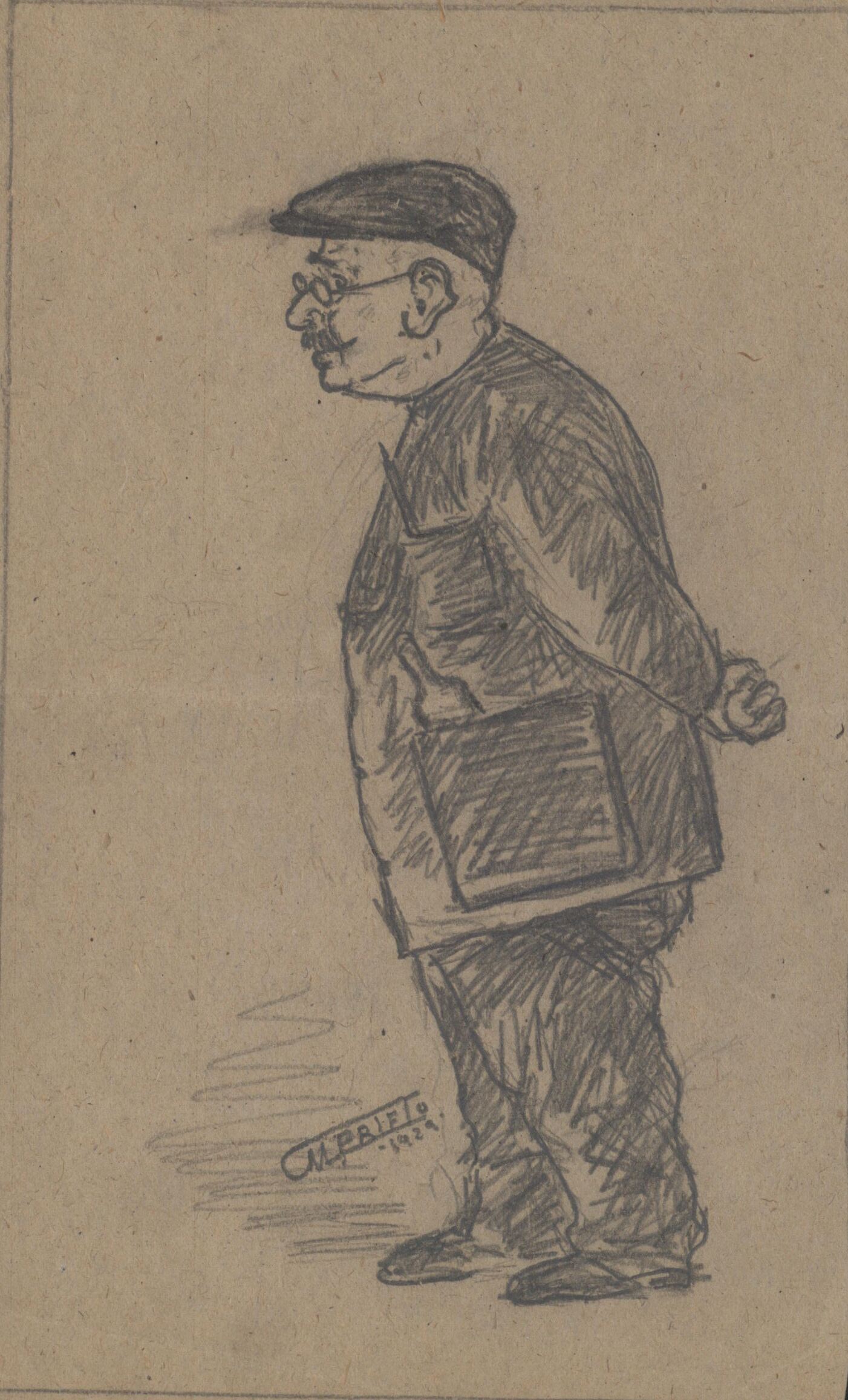 - Figura de un hombre anciano, con traje de chaqueta, visera y gafas, con gesto amable y manos cogidas a la espalda, del bolsillo de su chaqueta sobresale el cuello de una botella.