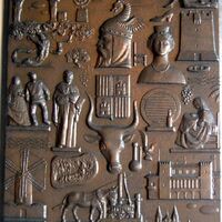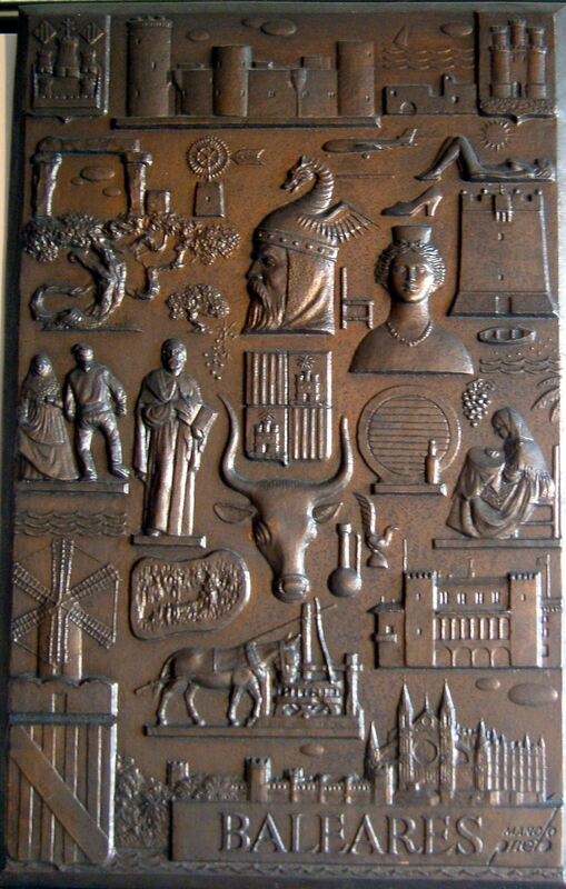- Fotografía de una placa de bronce representativa de Baleares, con las figuras y elementos iconográficos significativos de la región, entre ellos una joven tomando el sol en la playa.OTROS ARCHIVOS: Mbo/ 340 MEN/1317