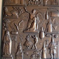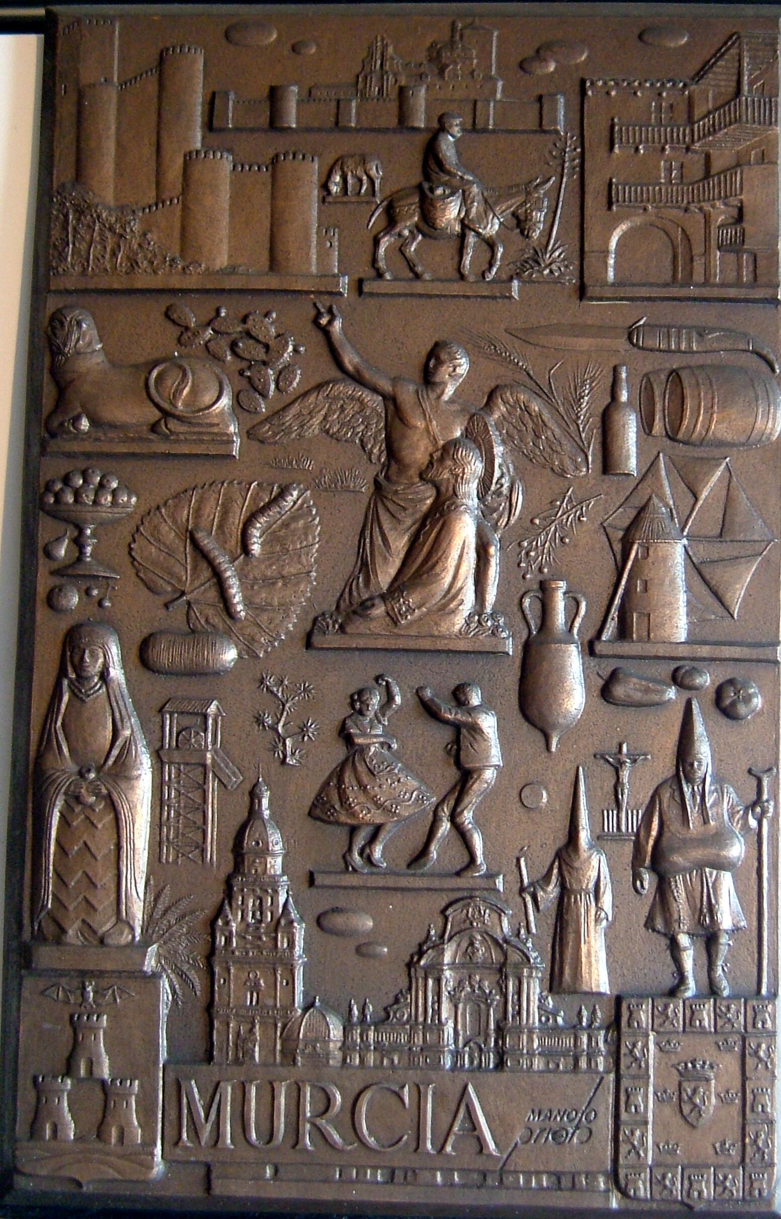 - Fotografía de una placa de bronce representativa de Murcia, con elementos iconográficos significativos de la región, como una imagen alusiva a la Oración en el Huerto de Salcillo.Otros Archivos: Mbo/ 333 MEN/1318