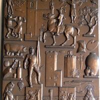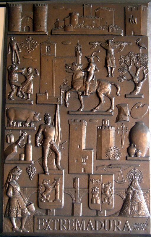 - Fotografía de una placa de bronce representativa de Etremadura, con elementos iconográficos significativos de la región, como es la figura ecuestre de Francisco Pizarro.Otros Archivos: Mbo/335 MEN/1326
