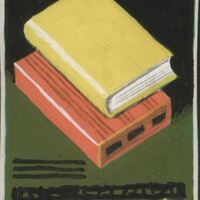 - Bajo el lema “coopera” se ha representado, en el dibujo enmarcado, sobre un fondo verde y negro un libro amarillo encima de un ladrillo naranja.