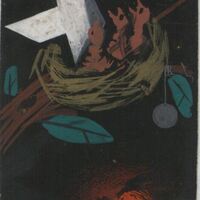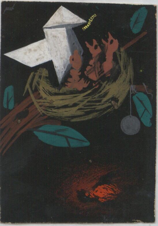 - Sobre un fondo muy oscuro destaca, en este dibujo, un nido sobre una rama con hojas verdes. En su interior se ven tres pájaros marrones y un pájaro de papel blanco que porta en su pico una lombriz amarilla para alimentarlos.