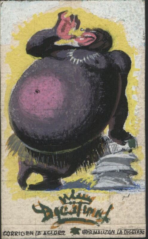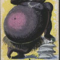 En este dibujo en donde está presente el boceto de la firma del pintor a la izquierda y sobre el título en color verde de difícil lectura se ha representado la figura de un hombre nativo, con la piel morada, semidesnudo llevando una falda de flecos y del que sobresale una gran barriga. Apoya su brazo izquierdo sobre unos sacos blancos y su mano derecha lleva algo a su boca de prominentes labios. Alrededor de su figura destaca el color amarillo.