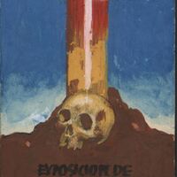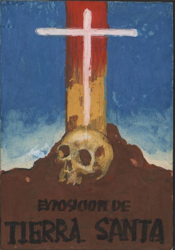 - En este cartel con el título en letras de color negro de “exposición de Tierra Santa” se ha representado la imagen de un calvario en el que destaca una cruz sobre un montículo de tierra marrón y a sus pies una calavera. Detrás de la cruz blanca destaca, en un cielo azul, una franja vertical de color amarillo y rojo.
