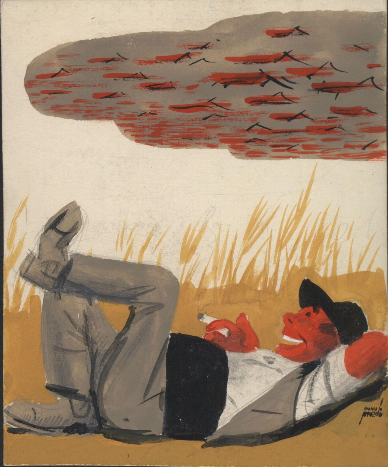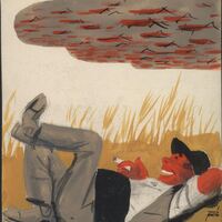 En el centro de esta escena se sitúa un hombre con una gran sonrisa tendido en el suelo boca arriba mientras cruza sus piernas, con la mano derecha sostiene un cigarro y su mano izquierda la lleva detrás de su cabeza. Lleva pantalón gris al igual que el chaleco y los zapatos, camisa blanca y fajín y sombrero negros. Parece observar una gran nube que se encuentra en el cielo gris y roja con algunos pájaros revoloteando en ella. El dibujo está firmado por el pintor en la esquina inferior de la izquierda.