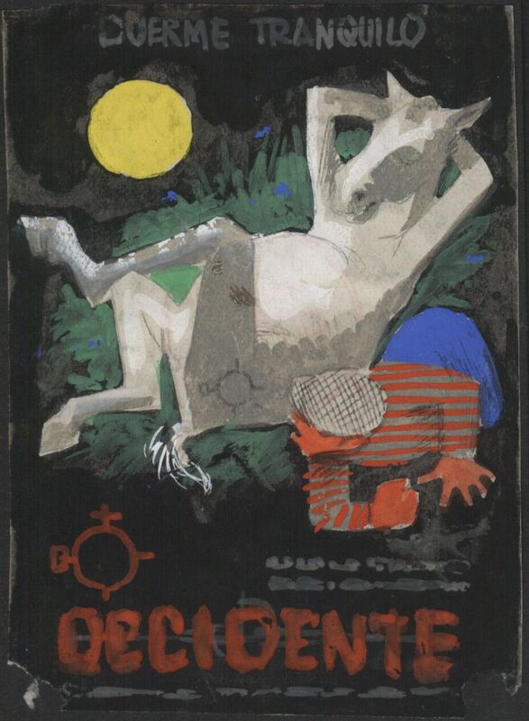 En la parte superior de este dibujo se puede leer en letras grises “duerme tranquilo”. Por debajo de este título se desarrolla la escena en la que un caballo blanco duerme como si fuera un humano, cruzando sus patas traseras y llevando sus patas delanteras bajo la cabeza, mientras el jinete, con pantalón azul y camiseta gris a rayas rojas, se encuentra agachado a su lado. Sobre un fondo negro brilla una gran luna amarilla. Tras esta escena destaca el título en letras rojas de “occidente”.