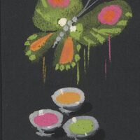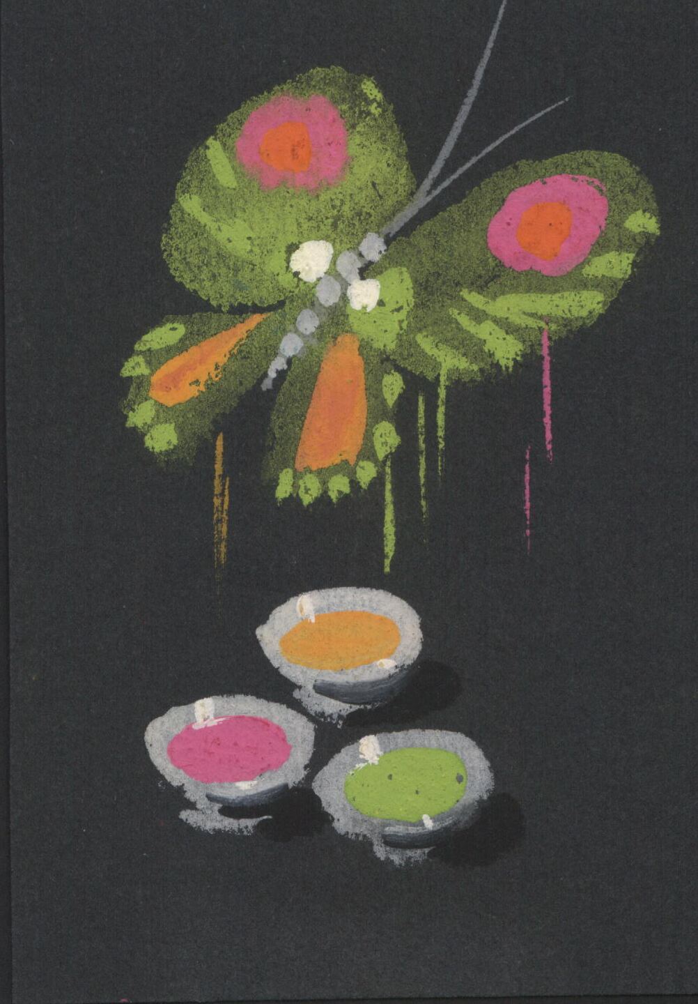 - Sobre un fondo completamente negro se ha representado en la parte superior una mariposa que vuela dejando caer gotas de pintura de sus alas sobre unos cuencos pequeños. Predominan los colores verde, rosa y naranja.