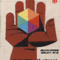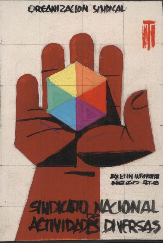 Sobre una superficie cuadriculada y bajo el título en letras negras de “sindicato nacional de actividades diversas” se ha dibujado una gran mano roja abierta y sobre la que se encuentra un cubo con sus lados de diferentes colores, amarillo, naranja, verde, rojo azul y morado. Por encima de la mano se lee, en letras de color negro, “organización sindical” y a su lado izquierdo “boletín informativo”.