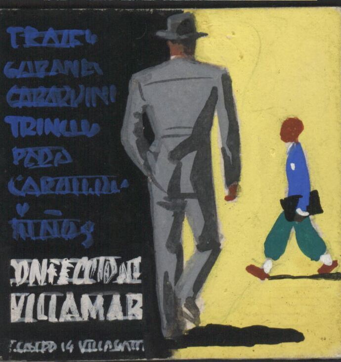 Este dibujo se encuentra dividido en dos partes: en la izquierda predomina el color negro sobre el que se escriben palabras en azul y blanco dando el título a la composición y en donde se ve la figura de un hombre de espalda vestido elegantemente con un traje gris y sombrero; en la derecha destaca el color amarillo en donde aparece un niño de perfil con pantalón verde y chaqueta azul llevando algún libro en su mano.