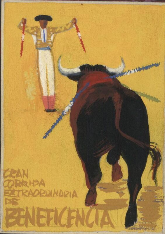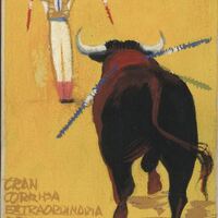 - En la imagen de esta escena taurina se representa al banderillero con el pantalón blanco y chaqueta amarilla, con una banderilla en cada mano, pronto a clavárselas al toro negro que se encuentra de espalda. El título del cartel se lee a la derecha, en la esquina inferior.