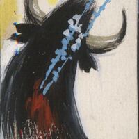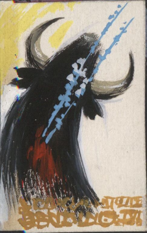 - Con el título en letras doradas, en la parte inferior, se representa en el centro del dibujo la cabeza de un toro vista de espalda con su gran cornamenta y dos banderillas azules clavadas en su lomo. El fondo del dibujo es blanco con una mancha amarilla en la parte superior de la derecha.