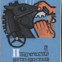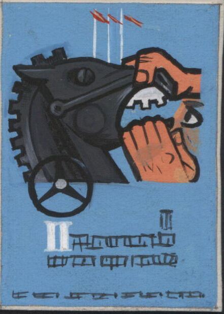 Sobre un fondo azul se representan en el dibujo tres elementos: una cabeza de caballo negra, un hombre que con sus manos intenta abrir su boca y un volante negro. Debajo se puede ver el boceto de algunas palabras en color negro de difícil lectura. En la parte superior se ven tres banderas de España sujetas a tres palos blancos.