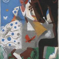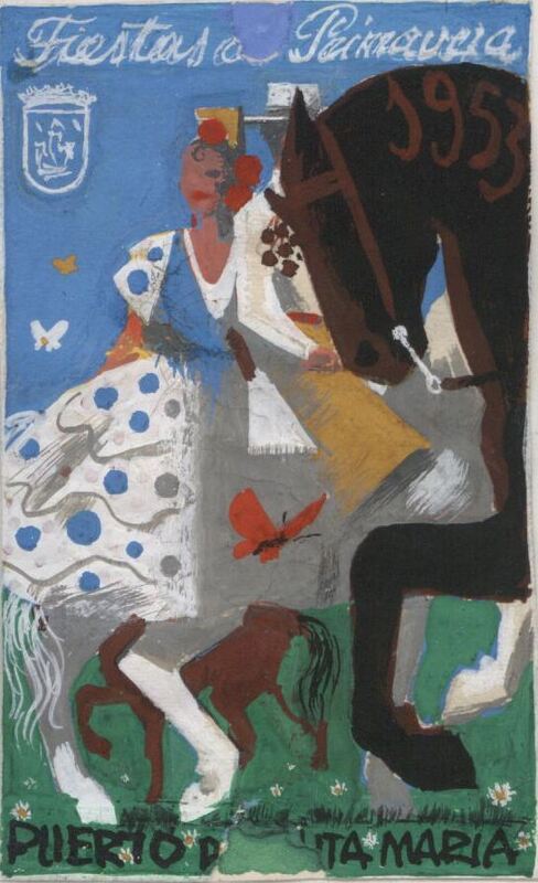 En este cartel que anuncia las fiestas del Puerto de Santamaría en el año 1953 se han representado en el centro de la composición varias figuras: en primer término, a la izquierda, destaca un caballo marrón; en el centro, una pareja con el traje andaluz sobre un caballo blanco; detrás, se vislumbra un caballo marrón. Tres mariposas amarilla, blanca y roja revolotean entre las figuras. En el fondo del dibujo destaca el color azul del cielo y la verde hierba sobre la que se sitúan los personajes de la escena.