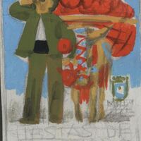 En este cartel que anuncia las fiestas de San Isidro, como se puede ver en el título realizado a lápiz y de forma abocetada en la parte inferior, se representa a un hombre que parece un vendedor ambulante llevando un burro marrón cargado con una cesta llena de algún producto de color rojo. El hombre con el traje verde, camisa blanca, fajín negro y sombrero grita intentando vender sus productos. En el fondo del dibujo destaca el color azul y al lado izquierdo del burro está presente el escudo de Madrid.