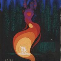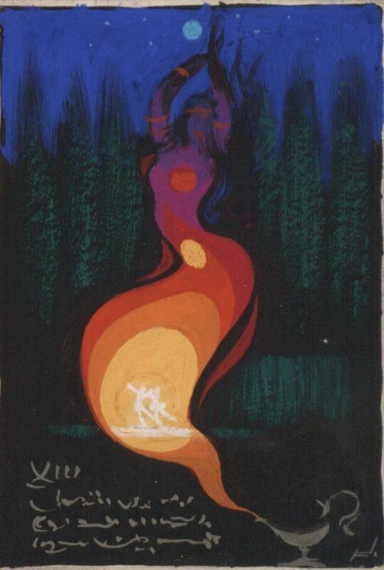 En este dibujo en el que se vislumbra el boceto de la firma del pintor en la esquina inferior izquierda se ha representado una lámpara gris de la que sale un genio en forma de humo de varios colores entre los que destacan el naranja, el rojo, el amarillo y el morado. Sobre su cuerpo se vislumbra la silueta blanca de una pareja de bailarines. El fondo del dibujo se compone de un paisaje nocturno con altos árboles verdes y un cielo de un azul muy oscuro con la luna de un azul más claro.