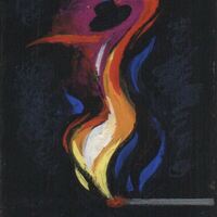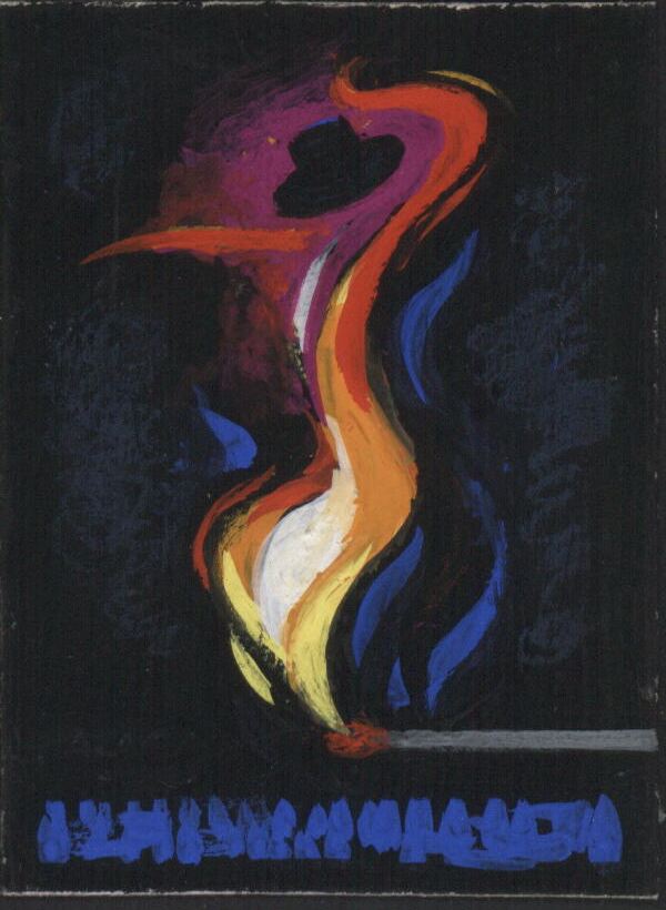 - Sobre un fondo negro llamas de variados colores, azul, blanco, amarillo, rojo y morado, intenta crear una silueta humana en la que destaca un sombrero negro. El título azul, en la parte inferior, es de difícil lectura por tratarse de un boceto.